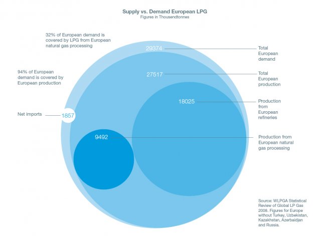 LPG currently satisfies about 1.6% of Europe’s total energy consumption, supplying more than 120 million European citizens. 94% of European demand is satisfied by European production (outside Russia) yet potential production is many times greater. In other words, Europe is and will remain highly self-sufficient in LPG.