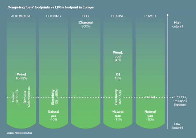 In domestic and industrial use, LPG generates an average of 15% less CO2 per kilowatt hour than oil, 50% less than coal and substantially less than the average European electricity distributed via the grid. All of this clearly suggests that the widespread adoption of LPG can make a major impact on reducing emissions of CO2.