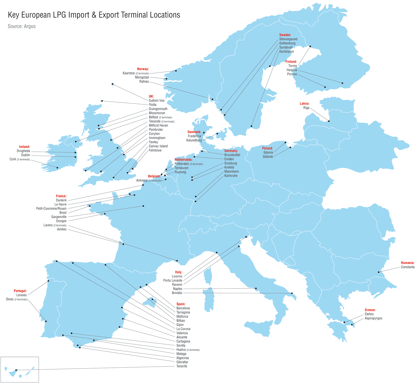 In order to guarantee continuous supply to its customers in Europe, SHV Energy has invested in a comprehensive infrastructure in the form of import terminals, regional depots and inland caverns. Terminals are strategically located around the coastline of the EU and SHV Energy continuously invests in the expansion and maintenance of these important assets.